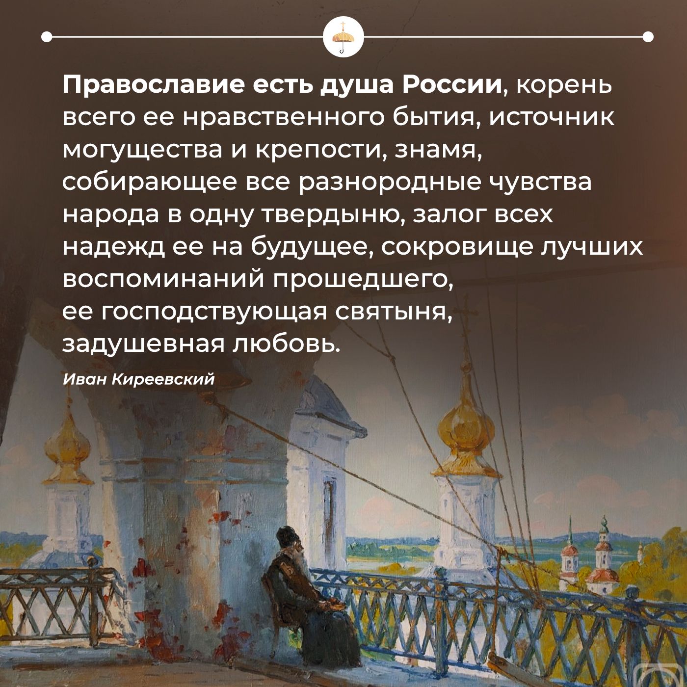— Православие есть душа России, корень всего ее нравственного бытия, источник могущества и крепости, знамя, собирающее все разнородные чувства народа в одну твердыню, залог всех надежд ее на будущее, сокровище лучших воспоминаний прошедшего, ее господствующая святыня, задушевная любовь.