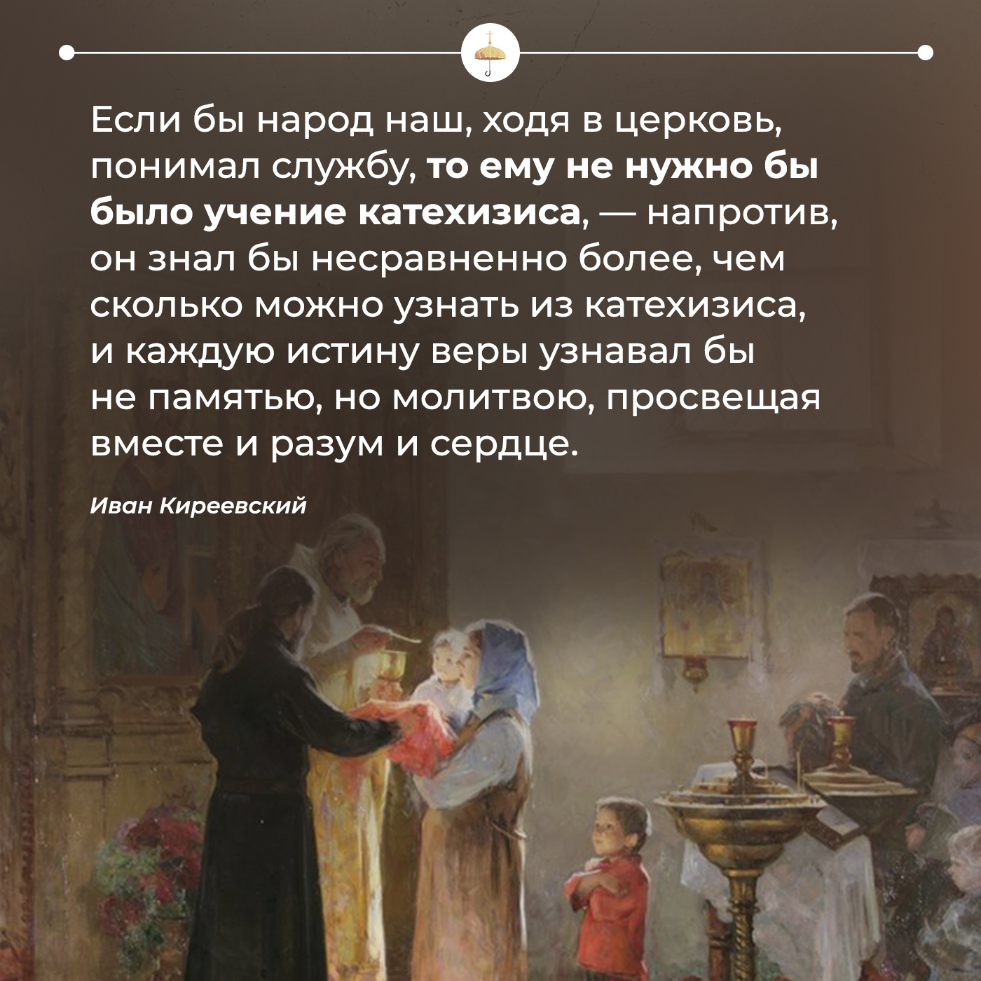 — Наше богослужение заключает в себе полное и подробное изложение не только тех догматов, которые преподаются в школах, но даже почти всех вопросов, которые вообще могут тревожить любознательность ума просвещенного. Следовательно, если бы народ наш, ходя в церковь, понимал службу, то ему не нужно бы было учение катехизиса, — напротив, он знал бы несравненно более, чем сколько можно узнать из катехизиса, и каждую истину веры узнавал бы не памятью, но молитвою, просвещая вместе и разум и сердце.