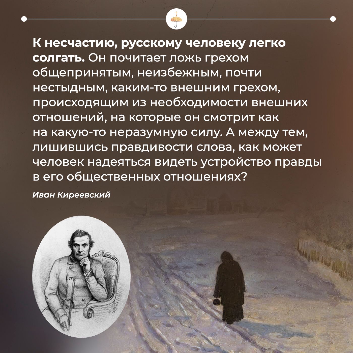 — Вовсе нет! До сих пор, слава Богу, русский народ еще не теряет своей чистой веры и многих драгоценных качеств, которые из этой веры рождаются, но, по несчастию, нельзя не сознаться, что он потерял уже одну из необходимых основ общественной добродетели: уважение к святыне правды. Ибо если есть какое зло в России, если есть какое-либо неустройство в ее общественных отношениях, если есть вообще причины страдать русскому человеку, то все они первым корнем своим имеют неуважение к святости правды.