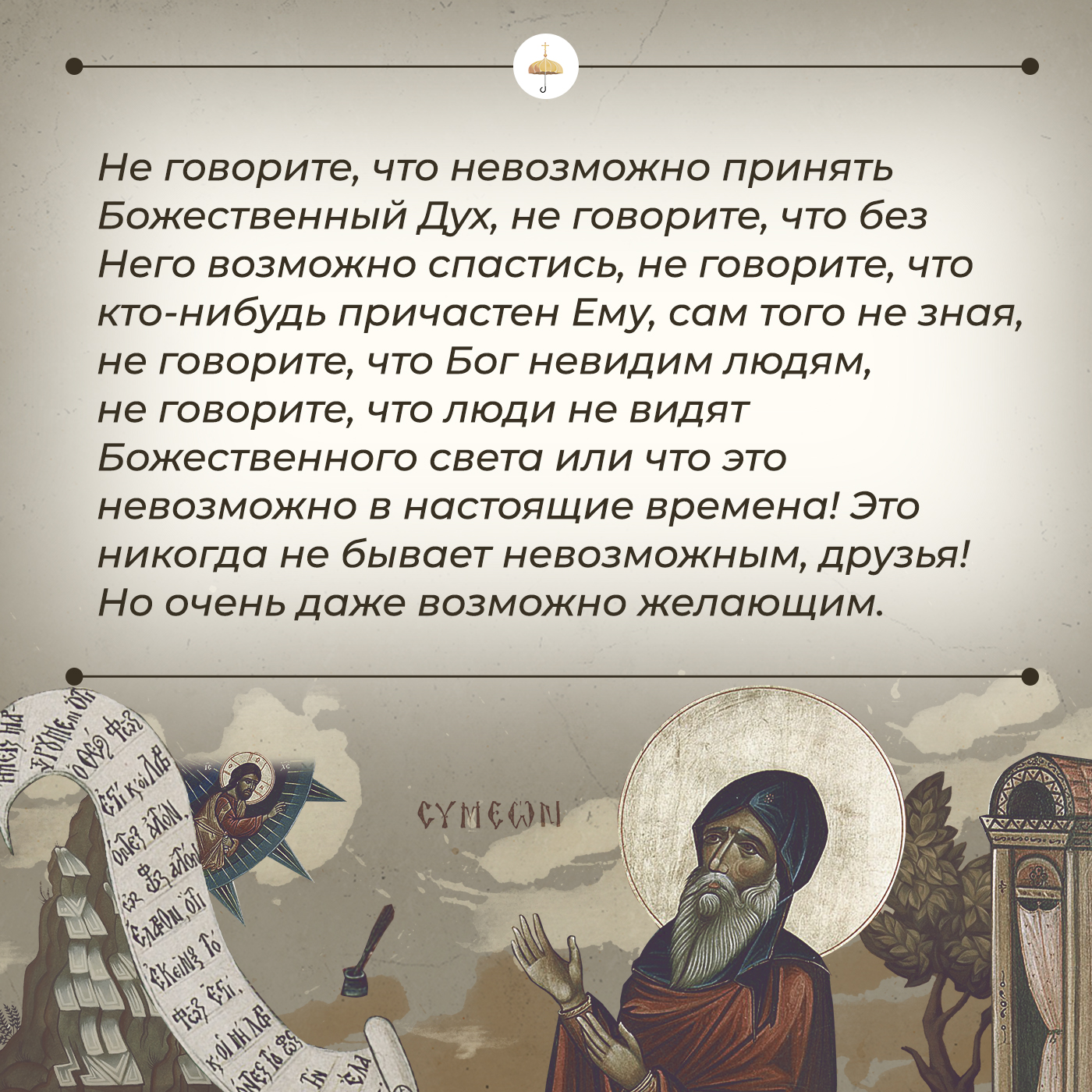 «Не говорите, что невозможно принять Божественный Дух, не говорите, что без Него возможно спастись, не говорите, что кто-нибудь причастен Ему, сам того не зная, не говорите, что Бог невидим людям, не говорите, что люди не видят Божественного света или что это невозможно в настоящие времена! Это никогда не бывает невозможным, друзья! Но очень даже возможно желающим». (Цит. по монографии Кривошеина).