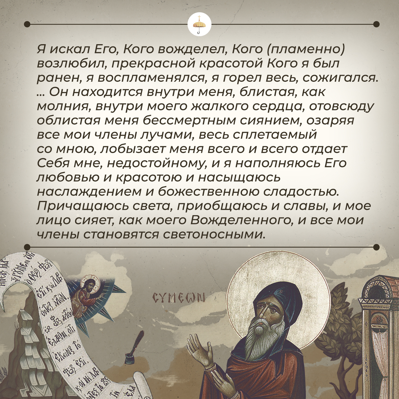 «Он находится внутри меня, блистая, как молния, внутри моего жалкого сердца, отовсюду облистая меня бессмертным сиянием, озаряя все мои члены лучами, весь сплетаемый со мною, лобызает меня всего и всего отдает Себя мне, недостойному, и я наполняюсь Его любовью и красотою и насыщаюсь наслаждением и божественною сладостью. Причащаюсь света, приобщаюсь и славы, и мое лицо сияет, как моего Вожделенного, и все мои члены становятся светоносными». (Цит. по монографии Кривошеина)