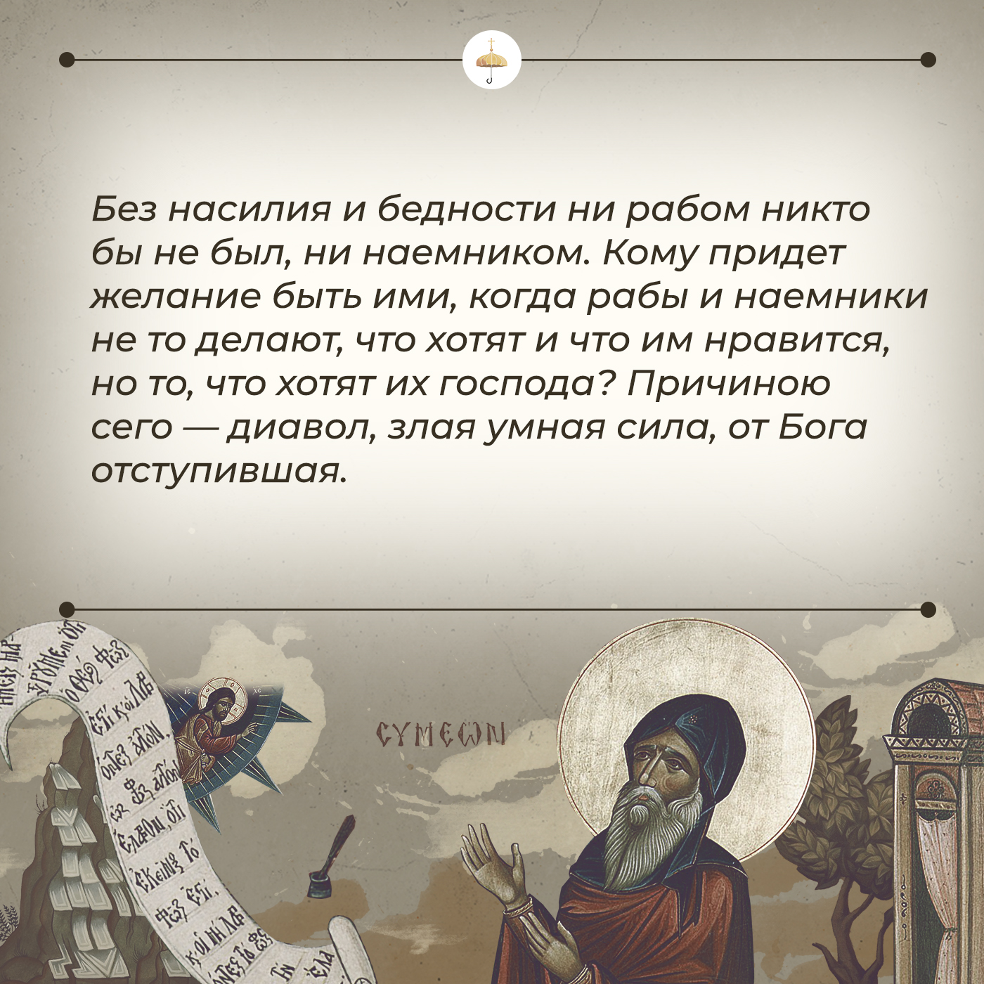 Итак, сущность рабовладения и наемной работы, исток и причина их воспроизведения, коренятся, по учению преподобного Симеона, в «насилии и бедности», в «грехе и зле», в «злой силе диавола». Крайне важна эта череда именований: «диавол» — теологическое именование того, что в моральном плане именуется «грехом и злом», а в «социально-экономическом» — «насилием и бедностью».