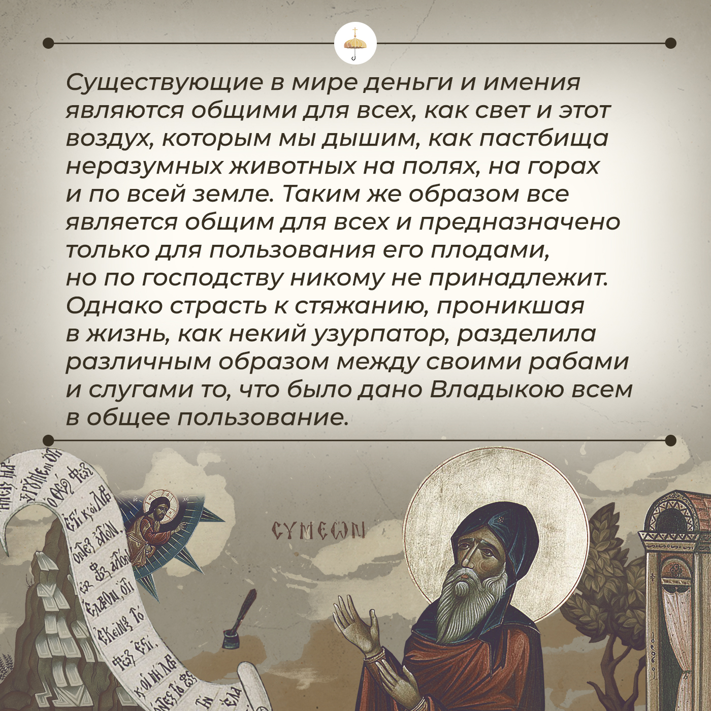 «Существующие в мире деньги и имения являются общими для всех, как свет и этот воздух, которым мы дышим, как пастбища неразумных животных на полях, на горах и по всей земле. Таким же образом все является общим для всех и предназначено только для пользования его плодами, но по господству никому не принадлежит. Однако страсть к стяжанию, проникшая в жизнь, как некий узурпатор, разделила различным образом между своими рабами и слугами то, что было дано Владыкою всем в общее пользование. Она окружила все оградами и закрепила башнями, засовами и воротами, тем самым лишив всех остальных людей пользования благами Владыки. При этом эта бесстыдница утверждает, что она является владетельницей всего этого, и спорит, что она не совершила несправедливости по отношению к кому бы то ни было. С другой стороны, слуги и рабы этой тиранической страсти становятся не владельцами вещей и денег, полученных ими по наследству, но их дурными рабами и хранителями. И если они, взяв что-нибудь или даже все из этих денег, из страха угрожаемых наказаний или в надежде получить сторицею, или склоненные несчастиями людей, подадут находящимся в лишениях и скудости, то разве можно считать их милостивыми или напитавшими Христа, или совершившими дело, достойное награды? Ни в коем случае, но как я утверждаю, они должны каяться до самой смерти в том, что они столько времени удерживали (эти материальные блага) и лишали своих братьев пользоваться ими.