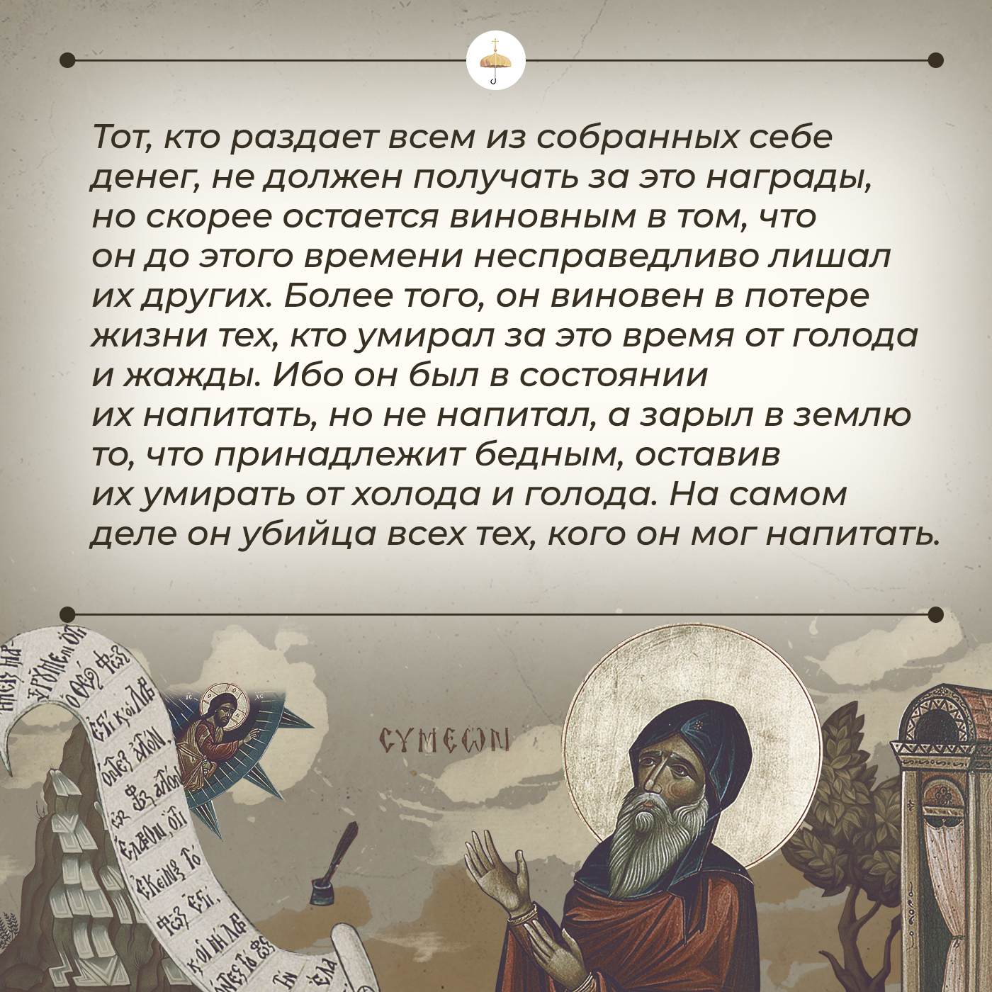 Дьявол внушает нам сделать частной собственностью и превратить в наше сбережение то, что было предназначено для общего пользования, чтобы посредством этой страсти к стяжанию навязать нам два преступления и сделать виновными вечного наказания и осуждения. Одно из этих преступлений — немилосердие, другое — надежда на отложенные деньги, а не на Бога. Ибо имеющий отложенные деньги не может надеяться на Бога. Это ясно из того, что сказал Христос и Бог наш: «Где, — говорит Он, — сокровище ваше, там будет и сердце ваше». Поэтому тот, кто раздает всем из собранных себе денег, не должен получать за это награды, но скорее остается виновным в том, что он до этого времени несправедливо лишал их других. Более того, он виновен в потере жизни тех, кто умирал за это время от голода и жажды. Ибо он был в состоянии их напитать, но не напитал, а зарыл в землю то, что принадлежит бедным, оставив их умирать от холода и голода. На самом деле он убийца всех тех, кого он мог напитать». (Слово 21)
