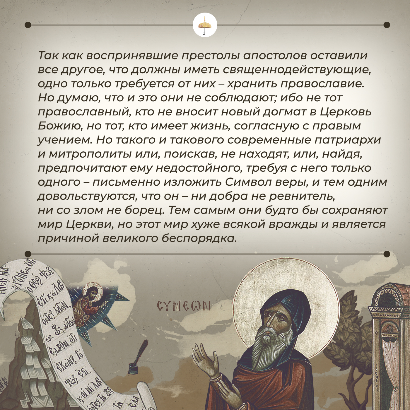 «Как уже было сказано, святые апостолы по преемству передавали эту власть тем, кто принимал их престолы, так как никто из остальных не смел даже подумать что-либо такое. Таким образом ученики Господа строго сохраняли [за собой] право этой власти. Но, как мы сказали, по прошествии времени достойные растворились среди недостойных, смешались с ними – и скрылись под большинством, один у другого оспаривая первенство и притворяясь добродетельными ради председательского [места]. Ибо с тех пор, как воспринявшие престолы апостолов оказались плотскими, сластолюбивыми, славолюбивыми и склонными к ересям, оставила их божественная благодать, и власть эта отнята от таковых. Поэтому так как они оставили все другое, что должны иметь священнодействующие, одно только требуется от них – хранить православие. Но думаю, что и это они не [соблюдают]; ибо не тот православный, кто не вносит новый догмат в Церковь Божию, но тот, кто имеет жизнь, согласную с правым учением. Но такого и такового современные патриархи и митрополиты или, поискав, не находят, или, найдя, предпочитают ему недостойного, требуя с него только одного – письменно изложить Символ веры, и тем одним довольствуются, что он – ни добра не ревнитель, ни со злом не борец. Тем самым они будто бы сохраняют мир Церкви, но этот [мир] хуже всякой вражды и является причиной великого беспорядка. От этого и священники испортились и стали, как народ. Ибо, как сказал Господь, никто из них не является солью (Мф. 5:13), чтобы посредством обличений связывать и хоть как-то сдерживать нравственный распад, но, напротив, сознавая и скрывая страсти друг друга, они сделались хуже народа, а народ хуже их. Некоторые же из народа оказались даже лучше священников, являясь словно бы углями на фоне беспросветного мрака последних. Ибо если бы священники, по слову Господа, сияли жизнью, как солнце (Мф 13:43), не были бы заметны раскаленные угли, но казались бы почерневшими в сравнении с более ярким светом.»