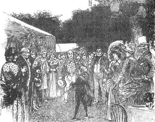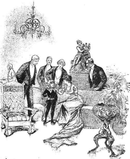 Толпа растеклась по парку. Тут были и фермеры с женами в праздничных платьях, девушки и парни, дети, старухи. В замке — знатные гости, приехавшие поздравить графа и познакомиться с миссис Эррол. Приехала леди Лорридэйл с мужем, сэр Томас с дочерьми, прелестная мисс Вивиан в окружении молодых людей и, конечно, мистер Хэвишем. Мисс Вивиан была в нарядном белом платье с кружевами. Увидев ее, маленький лорд побежал к ней навстречу. Мисс Вивиан поцеловала его, поздравила и пошла гулять с ним по парку. Он повел ее к мистеру Гоббсу и Дику и представил их как своих самых старинных друзей. Она подала, им руку и стала расспрашивать про Америку, про их путешествие, так что они оба остались в восторге от нее.