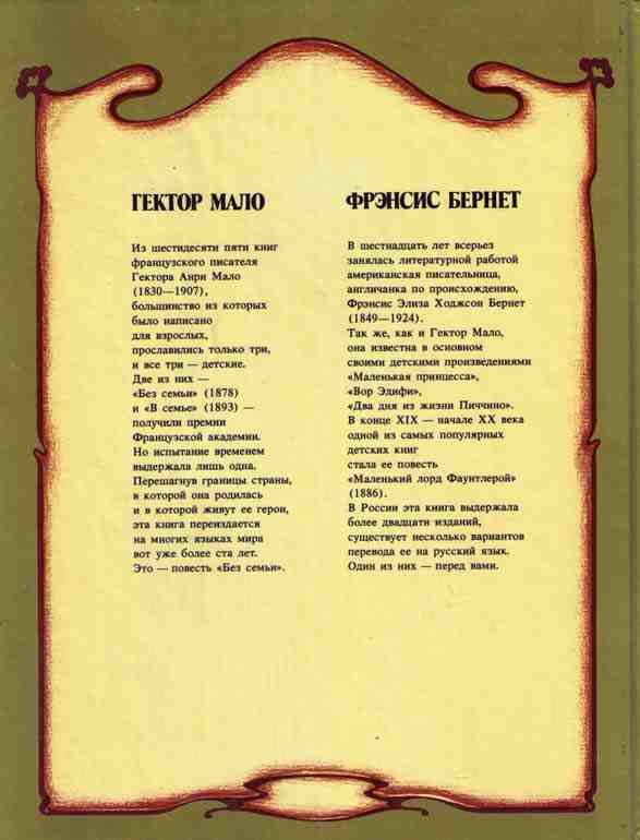 Одно из самых светлых и добрых впечатлений людей старшего поколения — небольшая книжка англо-американской писательницы Фрэнсис Ходгсон Бернетт «Маленький лорд Фаунтлерой», выходившая у нас и под названием «Маленький лорд», и «Приключения маленького лорда». Автору этих строк довелось читать ее в далекие довоенные годы. И по сей день помнится то теплое, радостное чувство, с каким бралась в руки эта книжка с рассыпающимися листками, как бережно передавалась друзьям и как прояснялись лица тех, кто говорил о ней.