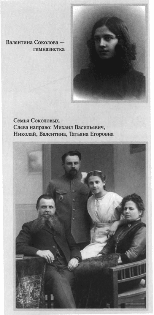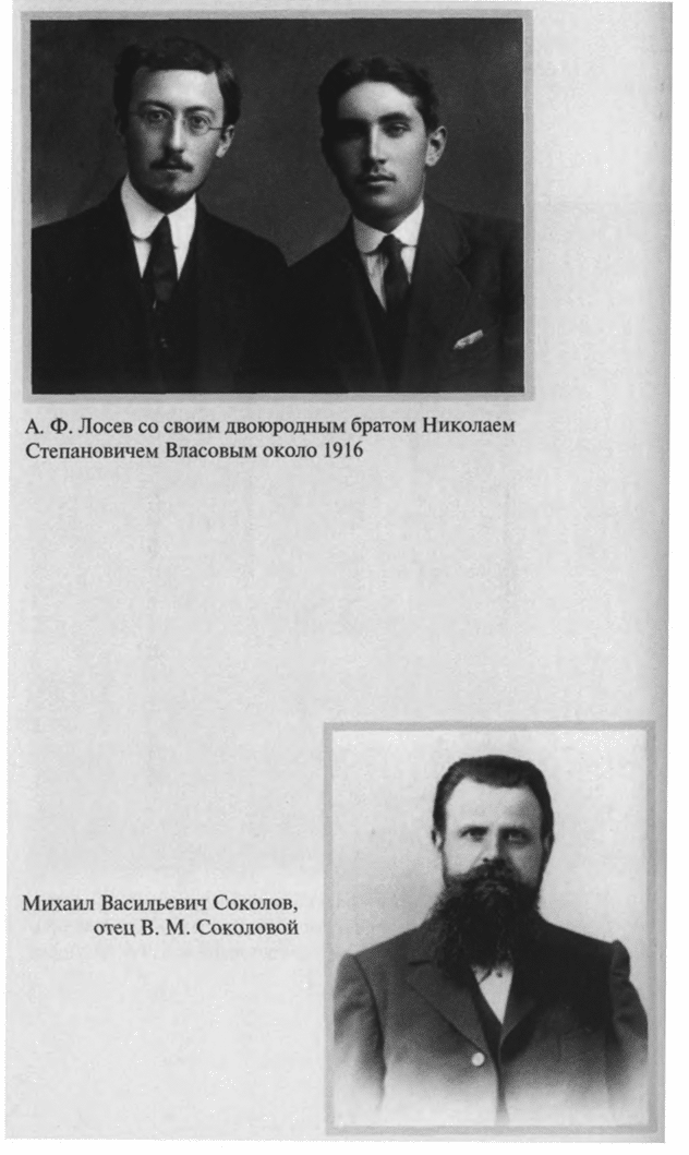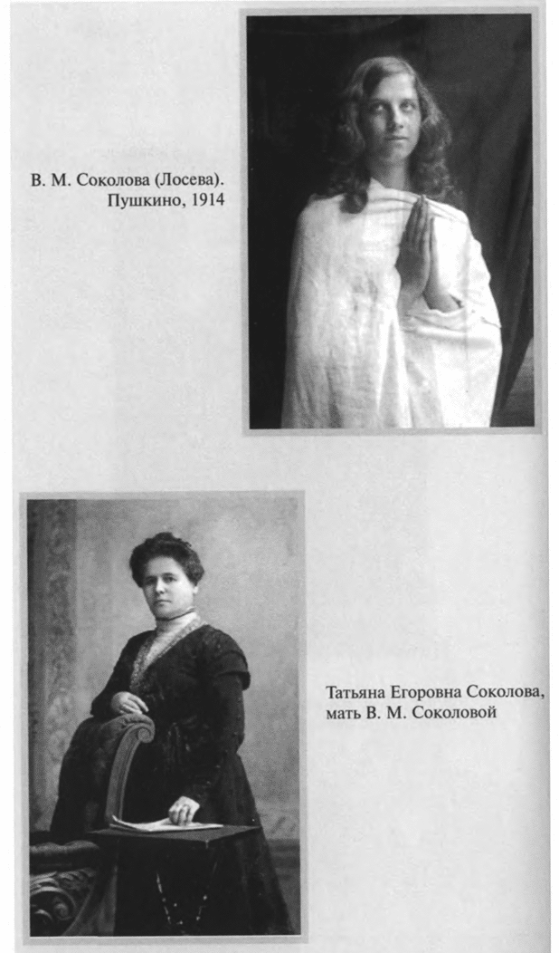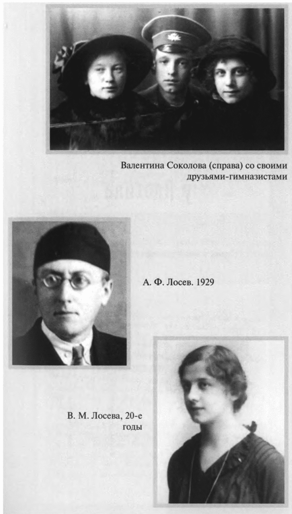 После Февральской революции, в мае 1917 года, окончивший университет и готовившийся к профессорскому званию Лосев снял квартиру в доме Соколовых на Воздвиженке — именно здесь накануне грядущих катастроф было суждено ему найти себе единомышленницу и помощницу, верную сподвижницу — Валентину Михайловну Соколову (1898—1954). Прекрасно образованная, владевшая тремя европейскими языками, учившая латынь и греческий, Валентина Михайловна мечтала стать астрономом и математиком. Любовь к математике зародилась у нее под влиянием гимназического учителя (окончила с отличием 1–ю Московскую женскую гимназию и дополнительное математическое отделение 4–й гимназии, в 1924 году — физмат 1–го МГУ, кандидатскую диссертацию по небесной механике защитила в 1935–м). После знакомства с Лосевым полюбила она и философию, и музыку. «Отзывчивость и готовность прийти на помощь были в ней поразительные, но вполне естественные. Статная. высокая, тонкая, она была красива особой утонченно–хрупкой красотой. Русые волосы, большие серые глаза, точеные черты лица, узкие руки с длинными пальцами, всегда в темном. Однако за этой хрупкостью скрывалась недюжинная сила воли…»[8].В 1921 году Лосев делает Валентине Михайловне предложение. Но предложение это необычное — он предлагает ей особый, духовный брак. 5 июня 1922 года их обвенчал о. Павел Флоренский.