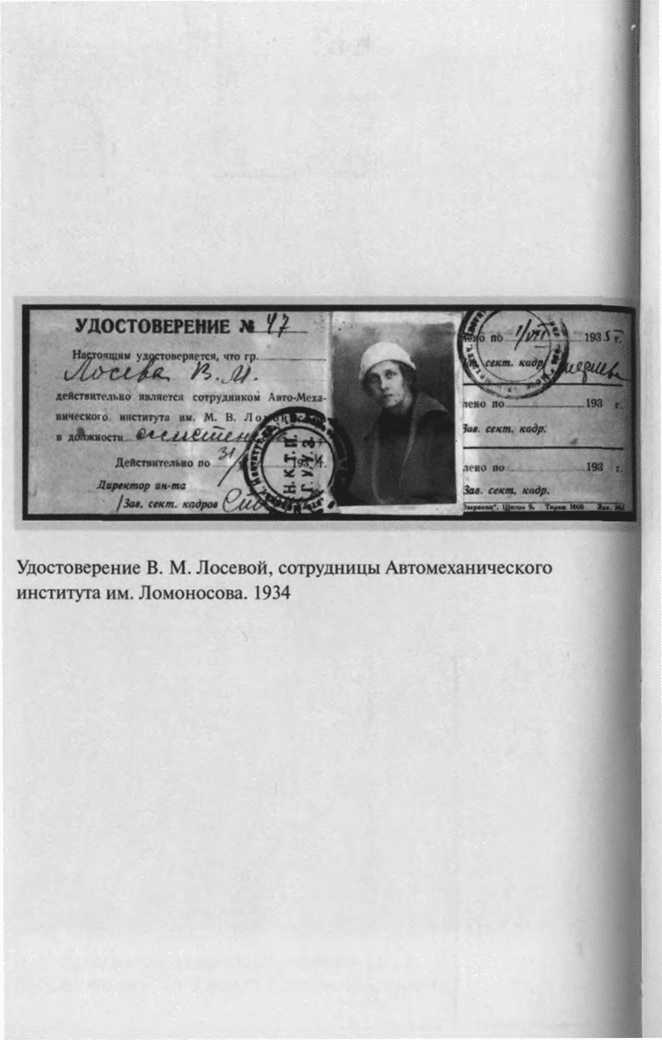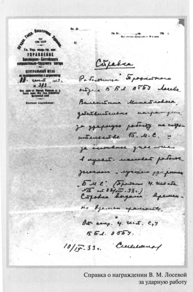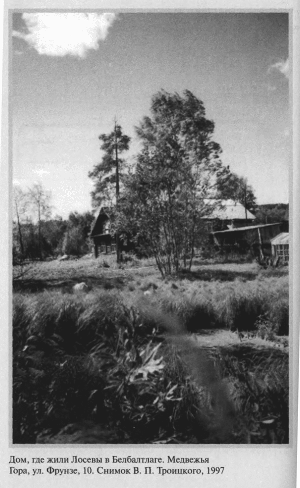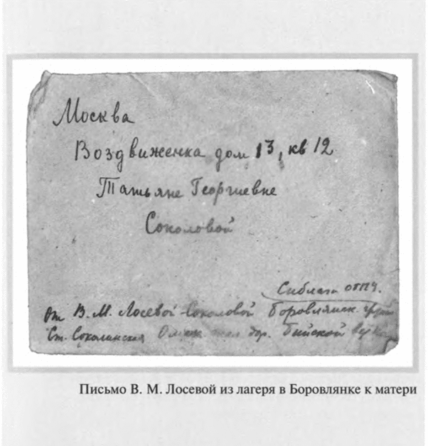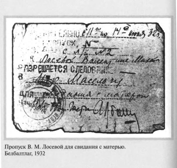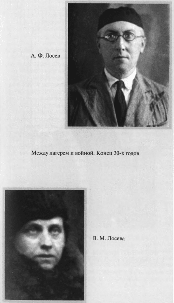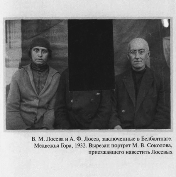 5 июня 1930 года, в годовщину свадьбы, была арестована и Валентина Михайловна. Бутырки. С 26 декабря по 23 июня 1931 года — Внутренняя тюрьма, затем снова Бутырки. После объявления приговора — пять лет лагерей — этап в Сиблаг, в Боровлянку на Алтай. Только благодаря помощи Политического Красного Креста, возглавляемого Е. П. Пешковой, супруги встречаются: Валентину Михайловну переводят с Алтая в лагерь на Медвежьей горе (Беломорско–Балтийский канал), где с 15 июля 1932 года полу-ослепший Лосев начинает работу старшим корректором в Проектном отделе Управления Беломорско–Балтийского комбината ОГПУ (так цинично важно звучала должность простого зека!). Здесь он вынужден работать «вольнонаемным» и после освобождения по постановлению Коллегии ОГПУ. К концу 1933 года Лосевы даже добиваются разрешения вернуться в Москву — оно получено потому, что с них, как и с других «ударников–каналоармейцев», снята судимость. Теперь предстоит заново учиться жить: в лагере отвыкли от всего — «и от людей, и от вещей», «уж не верится, что можно жить не в хлеву»[15].