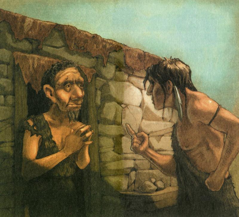 Отец детей, который подумал, конечно же, что его дети уже мертвы, вылетел из дома и начал ругать Фатта самыми страшными словами, которые только были в языке его племени — такими, как спзфлют и ббжкай-укк и даже бубблексг (ни одно из этих слов мы, к счастью, уже не можем произнести сегодня). Когда обезумевший от горя отец прекратил изрыгать ругательства, Фатт невозмутимо достал свой каменный топор и ударил мужчину по голове, убив его на месте.