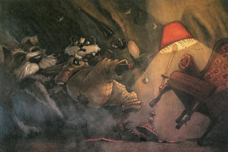 Битва была воистину страшной. Барсук рвал, царапал, бил когтями, кусал и дергал. Флип кусалась, терзала, хватала, рычала и тянула. Мех клочьями летел с обоих зверей, и они задыхались в неистовстве сражения. Вот Флип потащила мистера Мелеса в гостиную. Вот мистер Мелес, совершив колоссальный рывок, вернулся обратно в кабинет. От всего этого бедлама обрушился потолок, едва не засыпав их обоих, и это вынудило их выползти из кабинета.