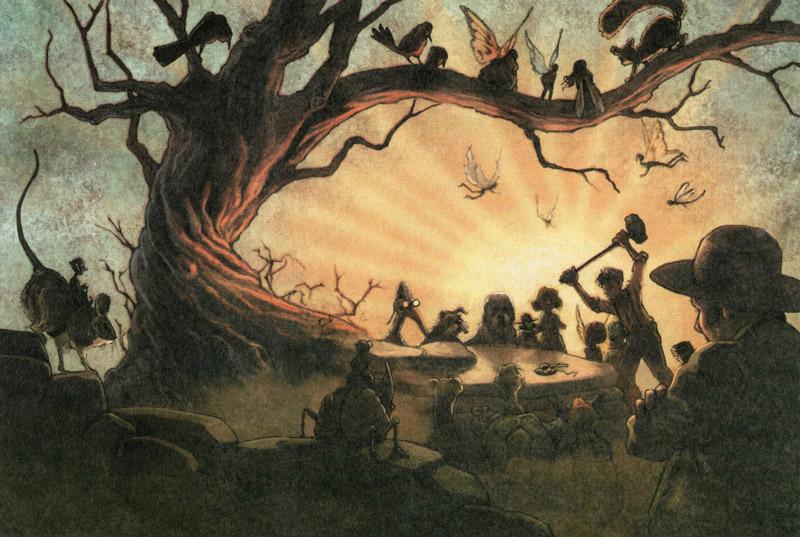 На следующее утро петухи закукарекали необычайно рано — в пять утра. Казалось, они тоже понимали, какой важный сегодня день. Кукушка, которая в этом году задержалась с отлетом из Дартмура, только уселась на верхушке своего любимого камня, когда вдруг, оглядевшись вокруг, увидела, как со всех сторон к нему идут толпы зверей, фей и других существ. Она была очень застенчивой птицей, и поэтому, смутившись, снялась с места и не останавливалась, пока не долетела до Франции.