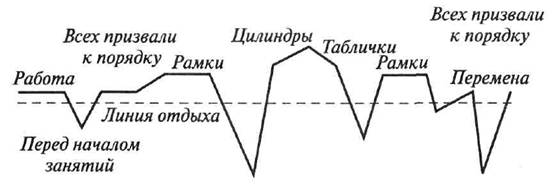 Кстати, вот и дети. Они входят, устраиваются, выбирают предметы, которые их заинтересовали, занимаются с ними, пока им это нравится, затем ставят на место и выбирают что-то иное. Поначалу периоды активной деятельности и отдыха чередуются совершенно хаотично. У каждого ребенка по-своему. Забавно наблюдать, как через некоторое время появляется определенный порядок. Первый час проходит в упражнениях средней степени трудности. Затем, после отдыха, в конце занятий, ученики сосредотачиваются на более трудной работе, которой занимаются довольно долго. И, наконец, испытывают потребность в разрядке.