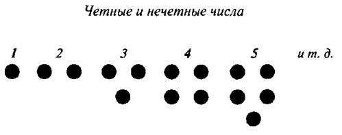 Ребенок кладет деревянные цифры и кубики (в нужном количестве) на карточки. Учитель пробует расставить кубики в два ряда. С красными это получается, с синими — нет: один в середине остается лишним. Затем то же самое делает ребенок. Учитель называет термин (четное — если делится на два ряда, нечетное — если остается один лишний в середине).