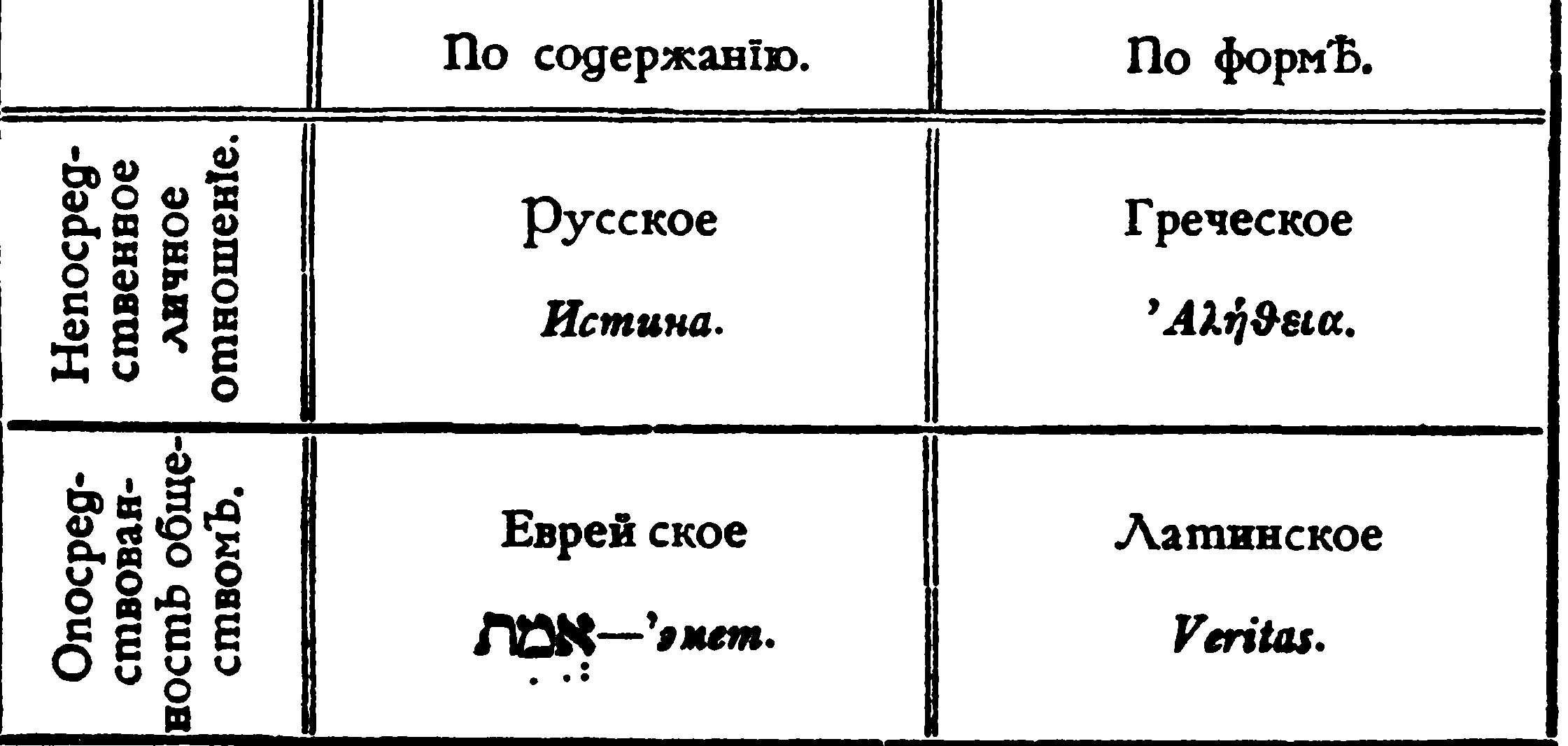 Достоверность удостоверяет меня, что Истина, если она достигнута мною, действительно есть то самое, чего я искал. Но что́ же я искал? Что́ разумел я под словом «Истина»? — Во всяком случае — нечто такое полное, что оно все содержит в себе и, следовательно, только условно, частично, символически выражается своим наименованием. Истина есть «сущеевсеединое», определяет философ[5]. Но тогда слово «истина» не покрывает собственного своего содержания, и чтобы, хотя приблизительно, ради предварительного осознания собственных исканий, раскрыть смысл слова истина, необходимо посмотреть, какие стороны этого понятия имелись в видуразнымиязыками, какие стороны этого понятия были подчеркнуты и закреплены посредством этимологических оболочек его у разных народов.