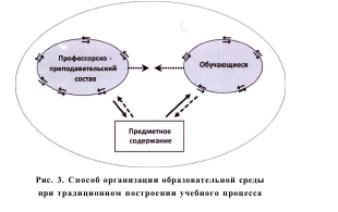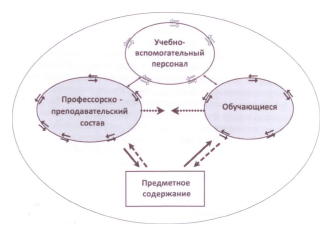 Подходы к образованию, рассмотренные в предыдущей главе, предполагают, что элементами, порождающими образовательную среду, являются преподаватели, обучающиеся и предметное содержание (см. рис. 3). Взаимодействие обучающихся и преподавателей представляет собой образовательный процесс, обеспечивающий достижение цели образовательной программы. Как правило, это взаимодействие (преподаватель — обучающиеся) осуществляется посредством учебного содержания, хотя отдельные модели (И. А. Колесникова, Ю. Г. Фокин, Э. Ф. Зеер, М. М. Левина) допускают непосредственное взаимодействие учащихся и преподавателей, однако отводя ему вторичную роль.