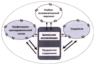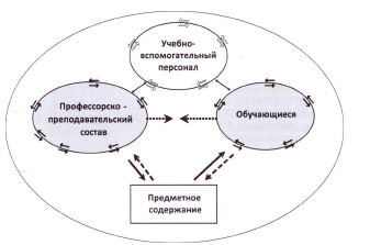 Следовательно, учебно–вспомогательный персонал также выступает в качестве субъекта образовательной среды и существенным образом влияет на качество образовательного процесса, поскольку именно он во многом определяет параметры организации образовательной среды, условия «встречи» преподавателя и обучающегося. Таким образом, возможность создания условий для деятельностного приобщения к предлагаемой обучающемуся ценностной системе должна быть изыскана в области взаимодействия на личностном уровне обучающегося не только с преподавателем, но со всеми участниками учебного процесса: учащимися, преподавателями, учебно–вспомогательным персоналом. Определим предмет этого взаимодействия.