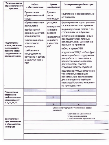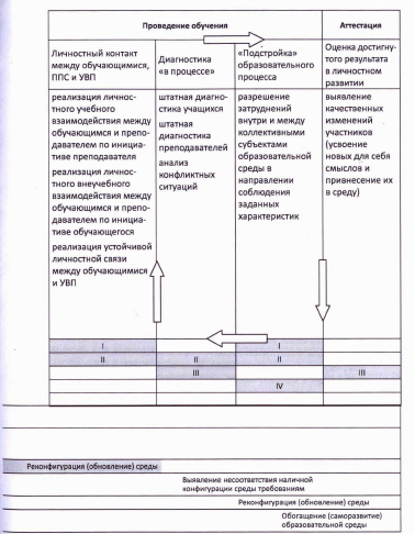 Для соблюдения перечисленных выше требований в типичном образовательном процессе следует выделить группу подпроцессов, которые влияют на формирование образовательной среды определенным образом. На рис. 6 (стр. 66—67) схематически представлена развертка типичных этапов образовательного процесса с выделением в каждом из них необходимых действий, ответственных за выполнение конкретных требований и соответствующих изменений в образовательной среде.