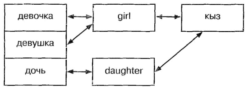 Форма у этих слов, конечно, различна, зато значение, казалось бы совершенно идентично. Но как только мы перейдем к практике перевода, тут же выяснится, что эти слова вовсе не тождественны друг другу. Окажется, что английское "girl" — это не только "девочка", но и "девушка", а татарское "кыз" — не только "девочка" и "девушка", но еще и "дочь":