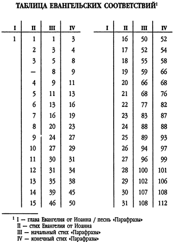 В настоящем издании текст «Парафразы» сопровождается текстом Евангелия от Иоанна, что не только канонически оправдано[19] и восходит к традиции ранних издателей (Франц Нансий издавал «Парафразу» вместе с евангельским текстом[20]), но и призвано свидетельствовать о том, что автор «Деяний Иисуса» все же толкователь, герменевт, экзегет Евангельского текста, изложению которого он следует по большей части неукоснительно, прибегая к вольностям и амплификации только при описании самых ярких и трагичных эпизодов, как, например, распятие Иисуса[21].