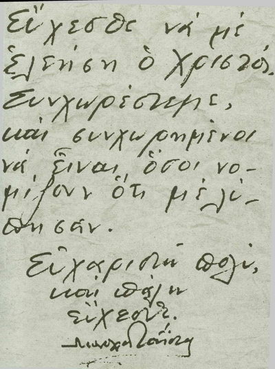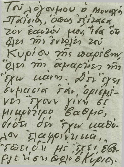 Я осмелилась попросить у игумении через какую-ту монахиню встречи со старцем Паисием. Монахиня была поражена, что я знаю о его присутствии в монастыре. В скором времени другая монахиня с фонариком ввела меня в его скромную келлию. Батюшка выглядел очень усталым. Волнуясь, я попросила, чтобы он объяснил мне потерю супруга. «Он должен был уйти, в противном случае он даже из расплавленного железа вышел бы живым», — сказал старец. Во время нашей беседы я с удивлением отметила, что он приводил цитаты из пролога одной книги моего супруга, благодаря которой он стал доцентом. «Но, Геронда, — пролепетала я, — именно об этом пишет мой супруг в своей книге “Дьявол в византийском искусстве”». Ах, Геронда, как я растрогана, какой счастливой чувствую себя от этой нашей беседы, как вы меня утешаете!» Немного позже, снова отвечая на мои вопросы, он затронул и другие темы. Он подарил мне вырезанную из дерева иконку Богородицы овальной формы и сказал, чтобы всегда носила ее с собой. Я пообещала, что в следующий раз привезу ему книгу своего умершего супруга. Однако со временем, к сожалению, об этом забыла. Как-то раз, когда посещала монастырь, мне сказали, что старец болен. Тогда я все вспомнила и вернулась в монастырь с книгой и письмом для старца.