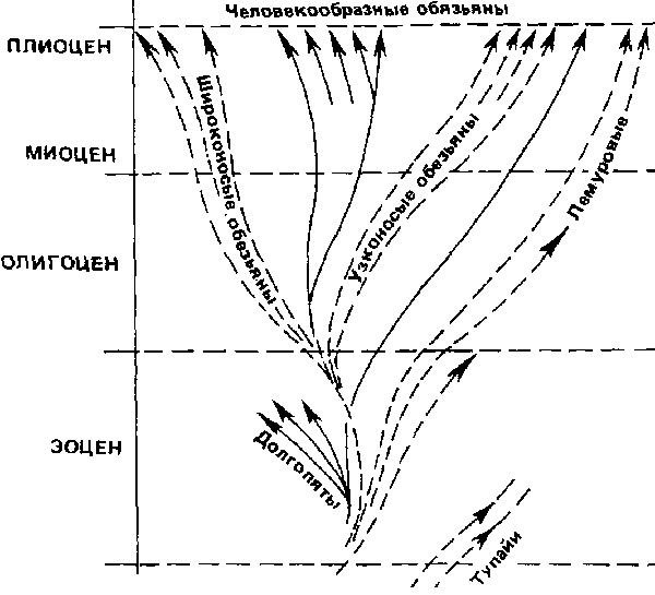 Лемуры и долгопяты имели свой апогей, первые к концу эоцена. Что касается человекообразных, то они обнаруживаются в Африке с олигоцена. Но максимума своего разнообразия и размеров они, несомненно, достигают лишь к концу плиоцена и всегда в тропических или субтропических зонах — в Африке, в Индии.