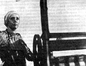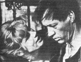 С правой стороны – пульт управления аппаратом. Абель нажимает одну из кнопок. Тотчас же вспыхивает невидимая снаружи лампа проектора, и на маленьком экране, установленном на противоположном конце стола, появляется неподвижное изображение. В кадре – фигура женщины, сидящей на стуле на фоне белой стены. Поза напряженная, лицо искажено страданием. Абель нажимает другую кнопку. Оба колеса начинают вращаться, лента скользит за линзой проектора, раздается негромкое шуршание, и кадр с изображением женщины оживает.