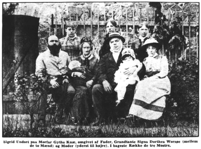 Сигрид Унсет родилась в доме семьи Гют, здесь же она провела первый год своей жизни. Здесь ей было хорошо, «как змейке на солнышке», по ее выражению. Имение принадлежало деду писательницы, советнику Петеру Андреасу Гюту. Большой, серьезный, своей старшей внучке Сигрид он напоминал медведя — особенно ворчанием. Он рано овдовел, и поэтому огромным домом в стиле ампир уже много лет заправляла невестка — или тетя Сигне, как ее звали восемь детей, которым она заменила мать. Мать Сигрид, Шарлотта (полное имя Анна Мария Николина Шарлотта Гют), будучи дочерью одного из самых влиятельных людей Калуннборга, имела возможность получить лучшее образование — она изучала языки в Копенгагене. Там она познакомилась с талантливым уроженцем Трёнделага Ингвальдом Унсетом. Ингвальд с детства мечтал стать ученым. Честолюбивый норвежец, никогда не расстававшийся с книгой, производил впечатление серьезного молодого человека, хотя и не лишенного чувства юмора. Его научные интересы были по большей части обращены в прошлое — он изучал дохристианскую культуру, не забывая, впрочем, о традициях родного Трёнделага. В 1875 году молодому ученому предложили место ассистента при кристианийском Собрании древностей, а год спустя он отправился в свою первую большую заграничную поездку и встретил в Копенгагене Шарлотту Гют. На юную лингвистку огромное впечатление произвели его увлеченность и горячий интерес к датским могильникам, курганам и краеведческим музеям: его занимало абсолютно все, что могло пролить свет на древние языческие времена.
