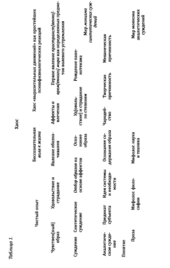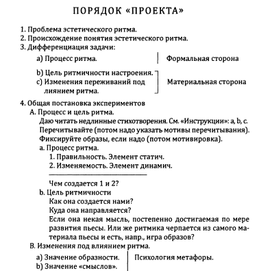 Если судить по структуре работы, то после дефиниций науки, философии, религии, искусства и, что очень важно, нравственности, автор распределяет эти пять составляющих, предполагая их рассмотреть в целом ряде комбинаций. Все главы завершаются 14–й главой, которая объединяет установленные им принципы высшего синтеза, и главой 15–й, где эти принципы высшего синтеза применяются к современной эпохе. Но это пока еще план. В действительности написана полностью глава «Религия и наука» (24 августа), а план со ссылками на огромное количество подсобного материала и текстов занял тоже один день 16 августа.