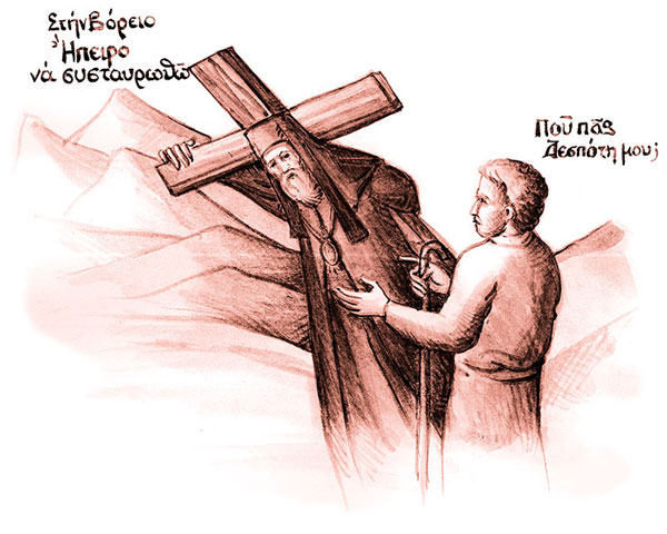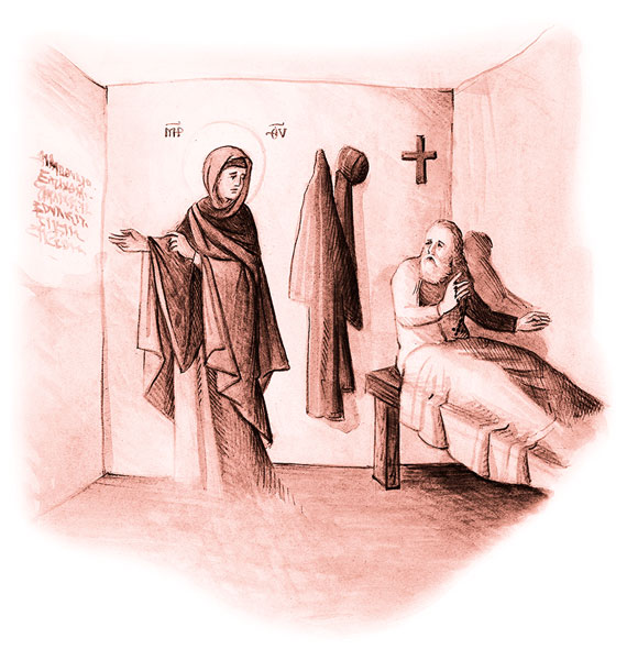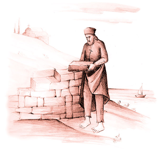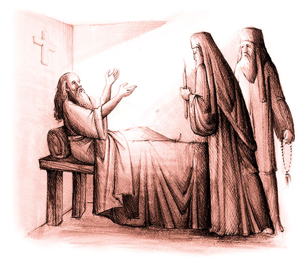 Первым, кого мы встретили, был отец Иоанн, очень сутулый от тяжёлых трудов и подвигов. Возможно, у него был повреждён позвоночник. Он стал расхваливать нам своего старца, как это обычно делает каждый хороший ребёнок, говоря о своём отце: «Мне трудно описать вам, как он любил богослужение, каким он был любвеобильным. Мне никогда не достичь его меры. Но то, в чём он превосходил всех, было его личное молитвенное правило: он всю ночь клал поклоны и молился, каким бы уставшим ни был после трудов, продолжавшихся целый день. Умирая, он сказал нам: «У меня нет денег, которые я мог бы вам оставить, но есть три тысячи правил, которые я исполнил сверх положенного, и если кто-то из моих послушников не будет успевать совершить своё правило, пусть берёт из моего излишка». Мы жили в трудное и полное опасностей время, и для того, чтобы прокормиться, нам нужно было трудиться и днём и ночью. Для живущих на Святой Горе монахов-чужестранцев есть только одно утешение: лопата, мотыга и какое-нибудь рукоделие».