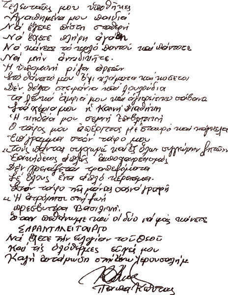 Как медик он был исследователем. Он сидел рядом с больными, относясь к ним очень серьёзно и с любовью. Если он должен был сообщить им что-то неприятное, то делал это настолько тактично, что даже самая тяжёлая болезнь казалась игрушкой. «Господь нас посетил», — говорил он. Он ободрял больного и всегда заканчивал лечение словами: «Вот, ты выздоровел. Смотри, больше не греши»[27]. Свои рецепты он писал таким красивым почерком, что фармацевты в аптеках брали их в рамку. Он провожал больных до выхода, сам вызывал лифт, заводил их в него и сопровождал их, как будто они были его детьми. Любезность Пандазиса по отношению к больным в его больнице останется, наверное, непревзойдённой в истории медицины.
