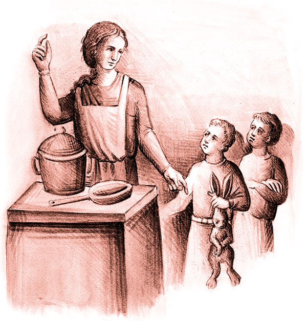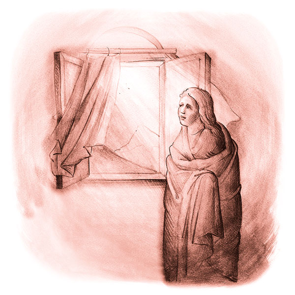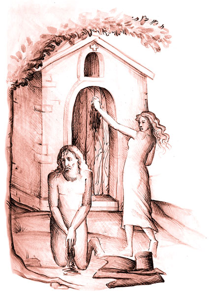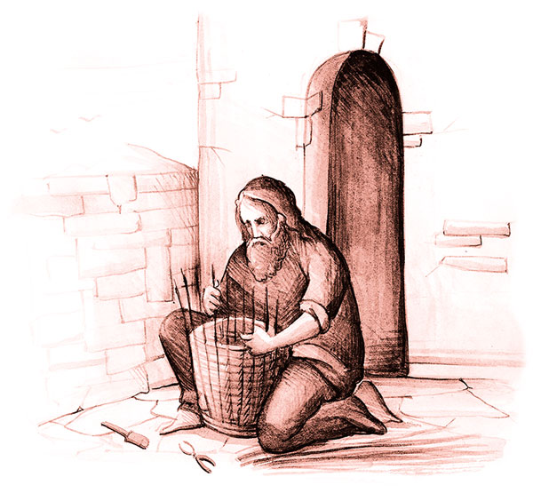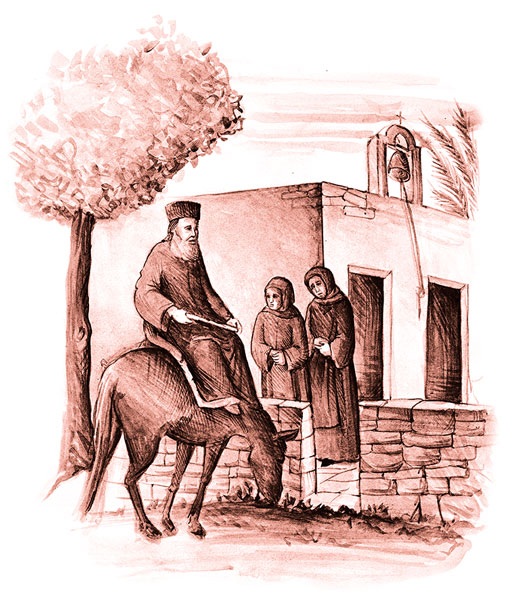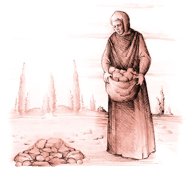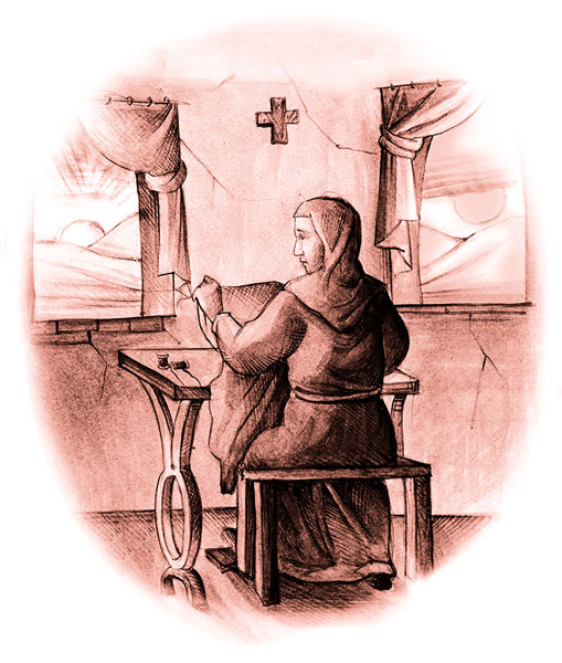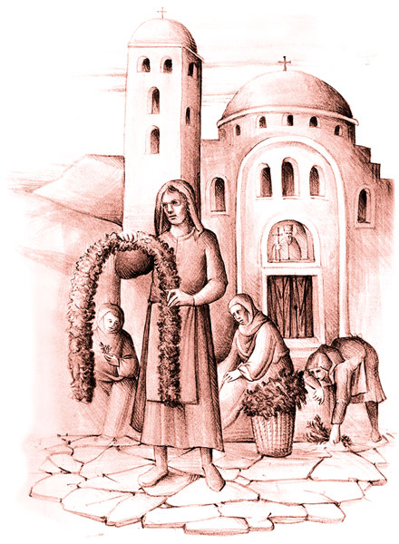 У неё был «сплетник», как у нас на острове называют ткацкий станок, на котором она ткала ткань из шерсти и ковровые дорожки, продажа которых давала ей средства к жизни. Кроме того, она делала церковные свечи, а обрезки виноградной лозы пережигала на уголь, который толкла в бронзовой ступке, чтобы сделать угольный порошок для каждения. Она зажигала неугасимые лампады, в полдень двенадцать раз ударяла в колокол и всегда была готова помочь каждому, кто заходил в храм и искал совета или доброго слова.