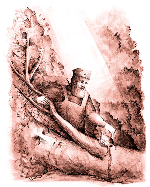 Он был высоким, стройным и худым, с лицом, загоревшим на солнце. Когда он проходил мимо, то казался скорее тенью, чем человеком. Его фигура, одетая в старую рясу, напоминала чёрную заупокойную свечу, но лицо было светлым, излучающим пасхальную радость. Он учил других своей жизнью, а не напыщенными словами или рассказами о чудесах и откровениях.