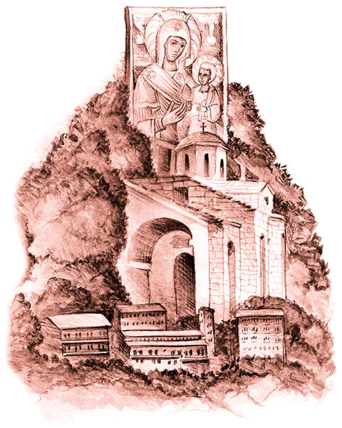 Он показал нам свою каливу святого Георгия, и мы пошли по тропинке к духовнику скита — отцу Дионисию. Солнце начало заходить, и тень от старой полуразрушенной башни накрыла весь скит. Эта высокая постройка говорила о его древности[269]. И действительно, это место было весьма подходящим для гнёзд божественных орлов — пустынников. Как в старину охотники говорили: «Это место богато зайцем», — так и любители уединённой жизни знали толк в выборе места, подходящего для заселения монахами.