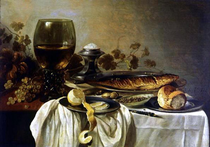 Очень интересны в этом смысле голландские и фламандские натюрморты. Знаменитые «Завтраки» или «Десерты» — это, по сути, напоминание о священной трапезе, о Тайной Вечере. Но мир в них словно бы раздваивается: Здесь есть намек на Таинство Евхаристии, дающей жизнь, и образ Валтасарова пира, несущего смерть. Есть «десерты» совершенно евхаристические по духу — простой стол, хлеб и вино, нож как символ жертвы. Но человек бежит от этой простоты, он жаждет валтасаровой роскоши — на некоторых картинах мы видим ковровые, изящную утварь, серебро, перламутр, различные экзотические яства. Традиционное искусствознание трактует эти натюрморты как гимн, прославляющий новый образ жизни буржуазного класса. Но это слишком легкое объяснение, которое на самом деле ничего не объясняет.