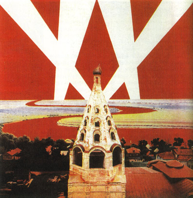 Более литературна картина «XX век». В центре холста изображена колокольня с покосившимся куполом и без креста на фоне кроваво- красного неба и кровавой реки. Небо прорезано четырьмя белыми лучами прожектора, образующими цифры XX.