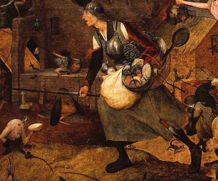 В одной старинной книге, сборнике пословиц, которая вышла в Антверпене в 1568 году, в брейгелевское время, я нашел такую пословицу: «Одна женщина — это шум, две женщины — много неприятностей, три — рынок, четыре — склока, пять — армия, а против шести не устоит сам дьявол». Здесь параллели между буйным женским характером и неустрашимостью, неостановимостью женщины — если уж ей что–то взбрело в голову, то она сделает это непременно; такой фольклорный образ сварливой жены, во всем перечащей мужу, который часто встречается в сказках народов мира.