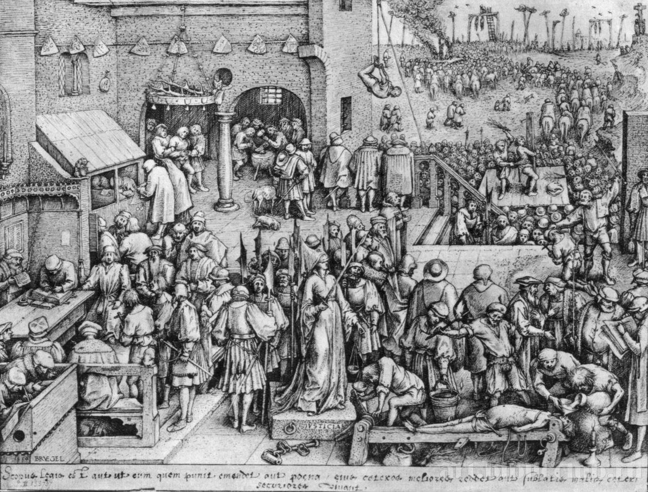 Вот гравюра по рисунку Брейгеля «Правосудие». Это многофигурная композиция, на которой изображены разные казни. В центре, на постаменте, строит фигура Правосудия с мечом, её глаза завязаны, она беспристрастна. В её правой, карающей руке — меч, в левой — весы; снизу надпись, чтобы мы не сомневались: «Юстиция». Она неподкупная, нелицеприятная, она и наказывает, она и взвешивает наши дела.