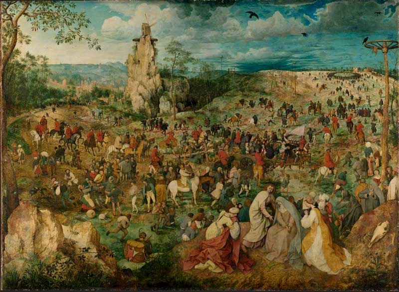 То есть, у мельницы есть много разных смыслов — аллегорических, символических, и так далее. И Соколов, рассуждая далее уже об этой мельнице на этой картине Брейгеля, говорит о том, что Брейгель изображает здесь не просто мельницу, он изображает нам колесо жизни и Фортуны, и эта Фортуна управляет всем в этом грешном падшем мире. Посмотрите, говорит Соколов, как народ бежит и едет, они движутся с левого края, из–под горы, от силуэта города на горизонте, условного Иерусалима, и дальше толпа идёт по дороге через всё полотно направо, к месту казни. А там чёрное плотное кольцо людей, они уже собрались смотреть на казнь. И среди этой толпы стоят два креста, а третьего ещё нет, его ещё несут. Появится третий крест — все трое осуждённых будут на них распяты.