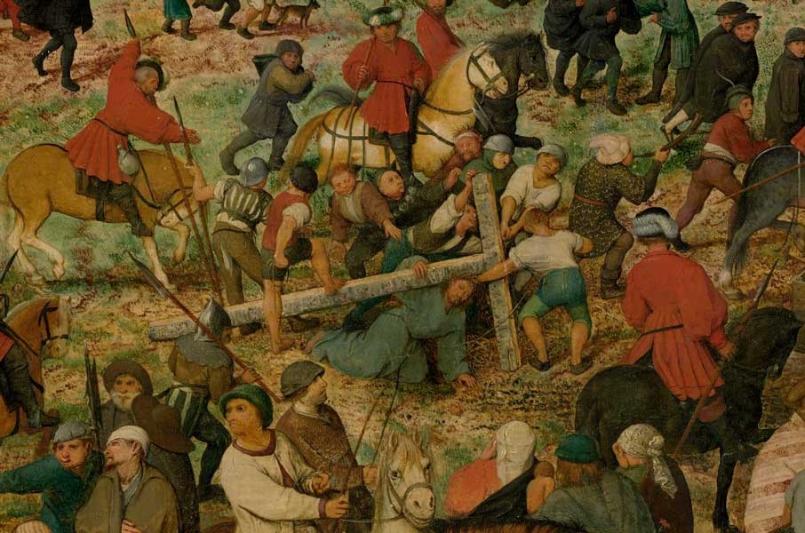 И в геометрическом центре это картины мы видим фактически замаскированного, хотя он никуда не прячется, Христа, несущего Т-образный крест. Христос падает под его тяжестью, и один человек этот крест тащит, другой его толкает, третий поставил на него ногу. Крест такой тяжёлый, что нести его невозможно, тем более, если кто–то ещё и ногу на него поставит.