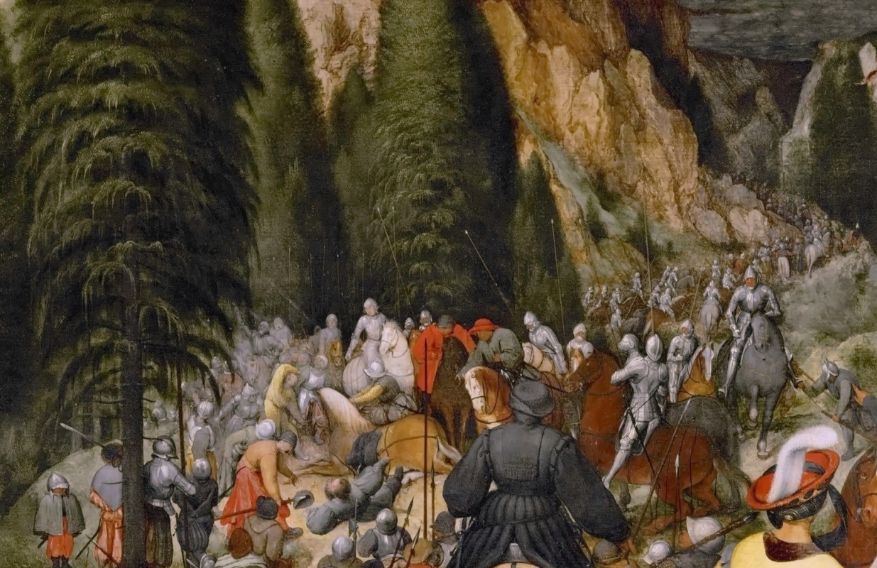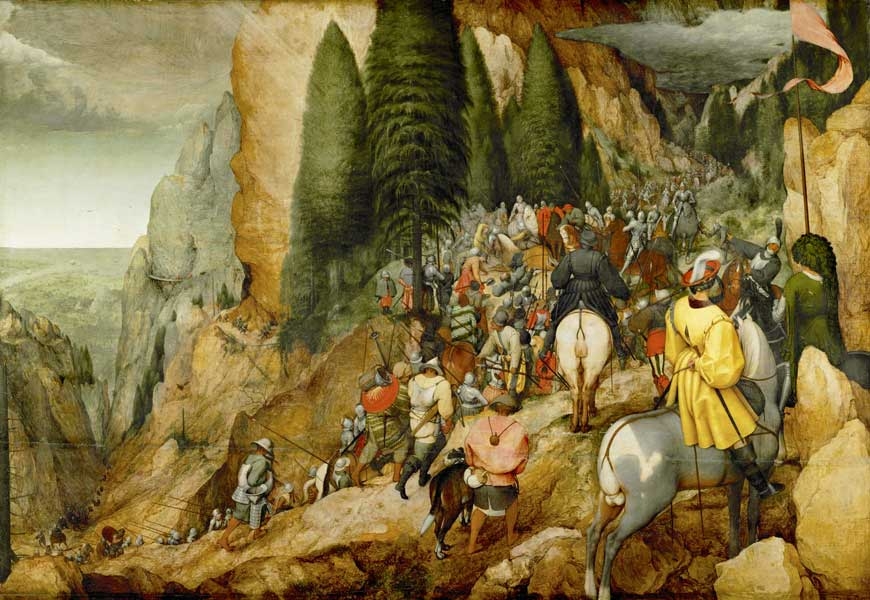 Так же устроена еще одна знаменитая картина Брейгеля. Если не знать, как она называется, то – что мы видим? Какие–то вооруженные люди идут через горы... Мы видим всадника в жёлтом, белый круп лошади, скалы, ущелье, массу людей с копьями, в стальных шлемах, доспехах, могучие деревья, которые возвышаются над этой толпой. И эта масса людей змеёй тянется из левого нижнего угла и уходит в правый верхний.