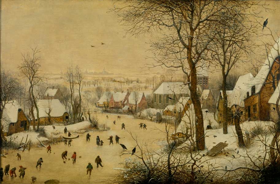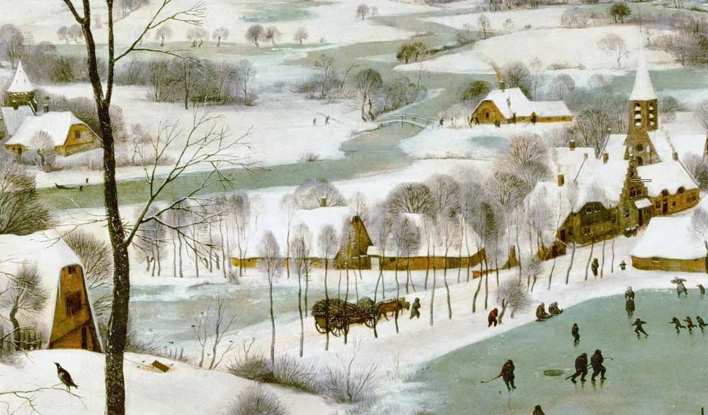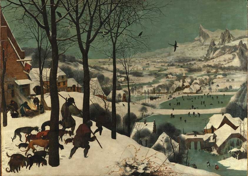 В картине «Охотники на снегу» Брейгель, хотя и взял абсолютно традиционные мотивы, но он их переворачивает. Охотников трое, с ними свора собак, на плечах те самые пики, как у охотников из «Великолепного часослова». Только кабана нет. Они не идут на охоту, они возвращаются с охоты. Сразу видно, что они идут устало, что собаки голодные, еле тащатся за ними. Они идут в городок, который сейчас их примет, они спустятся с холма и домой вернутся, потому что дальше в ту сторону на охоту идти некуда. Дальше замерзшая поверхность воды, знаменитый каток, а еще дальше — крыши домов, и какие–то невероятные для Нидерландов скалы, Брейгель писал их с набросков, сделанных им во время альпийского путешествия в Италию.