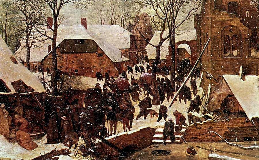 Мы понимаем, что это Святое семейство, сейчас произойдет самое главное событие мировой истории — родится Христос, сейчас, в этом городе, в эту зиму. Буквально в эту ночь, что наступит после этого дня, произойдёт это чудо, а люди вокруг этого не видят. И мы не видим, зрители. Только понимая, что перед нами Брейгель и вглядываясь в него, мы, находим, наконец, эту сцену.