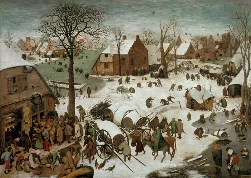 Или ещё одна евангельская зимняя картина, «Перепись в Вифлееме», ещё одна известная работа Брейгеля, написанная тоже в Брюсселе, после 1563 года, она находится в королевском музее Брюсселя. Здесь тот же принцип, если не знаешь название, то сразу не поймёшь сюжет картины.