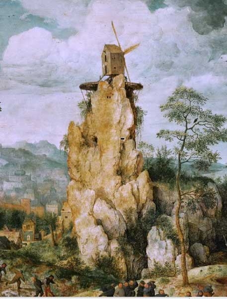 Если бы не название, при первом взгляде на неё можно было бы сказать, что здесь изображён какой–то народный праздник. Какие–то толпы людей, может быть у них там ярмарка проходит. Торчит какая–то скала, на ней стоит мельница — очень странная конструкция. Разве можно поставить на такую скалу такую мельницу? Такое впечатление, что нельзя, она того и гляди оттуда свалится. А, кроме того, таких скал в равнинных Нидерландах нет.
