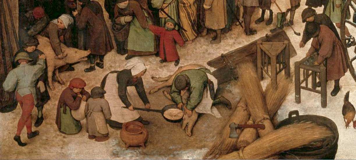 Посмотрим на фрагмент «Переписи в Вифлееме». Здесь тоже декабрь. Вот мужик навалился коленом и руками на свинью, и уже наметился ударить ножом в горло. Свинья лежит, открывши пасть. Вот женщина держит что–то типа сковороды на длинной ручке, подставляет, чтобы собирать кровь. А рядом лежат такие же по размеру пучки соломы, что и в «Охотниках на снегу», и топор. Всё приготовлено для того, чтобы свинью убить, опалить и разделать. Эта солома лежит здесь не зря, она для опаливания туши. А в «Охотниках на снегу» солома есть, а свиньи нет. И это очень любопытно.
