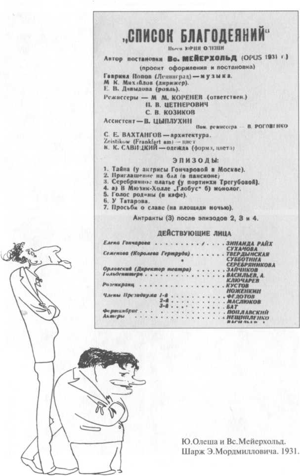 Мейерхольд — центральный герой дневника начала 1930-х годов. Понятно почему: в 1930 году Олеша пишет, а в 1931-м Мейерхольд репетирует пьесу «Список благодеяний», где главная героиня (ее играла Зинаида Райх) — alter ego Олеши. Это его мучительные мысли владеют ею, ее устами высказываются. Мысли о расстрелах, о том, что «расстроились части речи» и что в Советской России исчезли все вещи — остались лишь понятия. Мысли об утекающем сквозь пальцы времени единственной жизни, данной человеку. О стремлении человека слиться с миром и о том, что на Родине он перестал ощущать себя «дома». О бездомности личности и драматической бесцельности творческого акта, не разделенного равными художнику людьми. Об исчезновении элиты и разрушении всей прежней структуры общества…