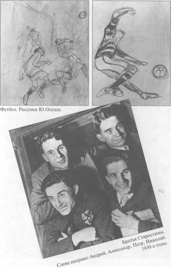 С. 288. Я загнал гол… — О том же, забитом Олешей и решившем исход матча голе вспоминает Катаев: «Крайний левый перекинул мяч с одной ноги на другую и ринулся вперед — маленький, коренастый, в серой форменной куртке Ришельевской гимназии, без пояса, нос башмаком, брюки по колено в пыли, потный, вдохновенный, косо летящий, как яхта на крутом повороте» (Катаев В. Алмазный мой венец. С. 7–8).
