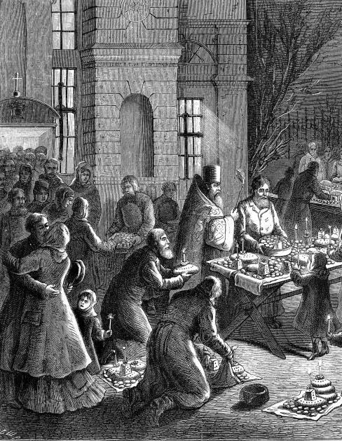 Освящение Пасхи, куличей и яиц на дворе Знаменской церкви, на Невском проспекте, в Санкт-Петербурге.