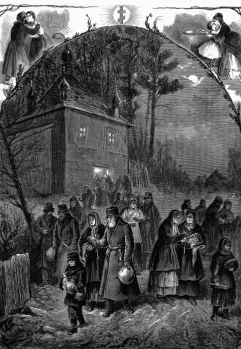 Я заснул в обыкновенное время, но вдруг отчего-то ночью проснулся: комната была ярко освещена, кивот с образами растворен, перед каждым образом, в золоченой ризе, теплилась восковая свеча, а мать, стоя на коленях, вполголоса читала молитвенник, плакала и молилась. Я сам почувствовал непреодолимое желанье помолиться вместе с маменькой и попросил ее об этом. Мать удивилась моему голосу и даже смутилась, но позволила мне встать. Я проворно вскочил с постели, стал на коленки и начал молиться с неизвестным мне до тех пор особого рода одушевленьем; но мать уже не становилась на колени и скоро сказала: «Будет, ложись спать». Я прочел на лице ее, услышал в голосе, что помешал ей молиться. Я из всех сил старался поскорее заснуть, но не скоро утихло детское мое волненье и непостижимое для меня чувство умиленья. Наконец мать, помолясь, погасила свечки и легла на свою постель. Яркий свет потух, теплилась только тусклая лампада; не знаю, кто из нас заснул прежде. К большой моей досаде, я проснулся довольно поздно: мать была совсем одета; она обняла меня и, похристосовавшись заранее приготовленным яичком, ушла к бабушке. Вошел Евсеич, также похристосовался со мной, дал мне желтое яичко и сказал: «Эх, соколик, проспал! Ведь я говорил тебе, что надо посмотреть, как солнышко на восходе играет и радуется Христову Воскресенью». Мне самому было очень досадно; я поспешил одеться, заглянул к сестрице и братцу, перецеловал их и побежал в тетушкину комнату, из которой видно было солнце, и, хотя оно уже стояло высоко, принялся смотреть на него сквозь мои кулаки. Мне показалось, что солнышко как будто прыгает, и я громко закричал: «Солнышко играет! Евсеич правду сказал». Мать вышла ко мне из бабушкиной горницы, улыбнулась моему восторгу и повела меня христосоваться к бабушке. Она сидела, в шелковом платке и шушуне, на дедушкиных креслах; мне показалось, что она еще более опустилась и постарела в своем праздничном платье. Бабушка не хотела разгавливаться до полученья петой пасхи и кулича, но мать сказала, что будет пить чай со сливками, и увела меня с собою.